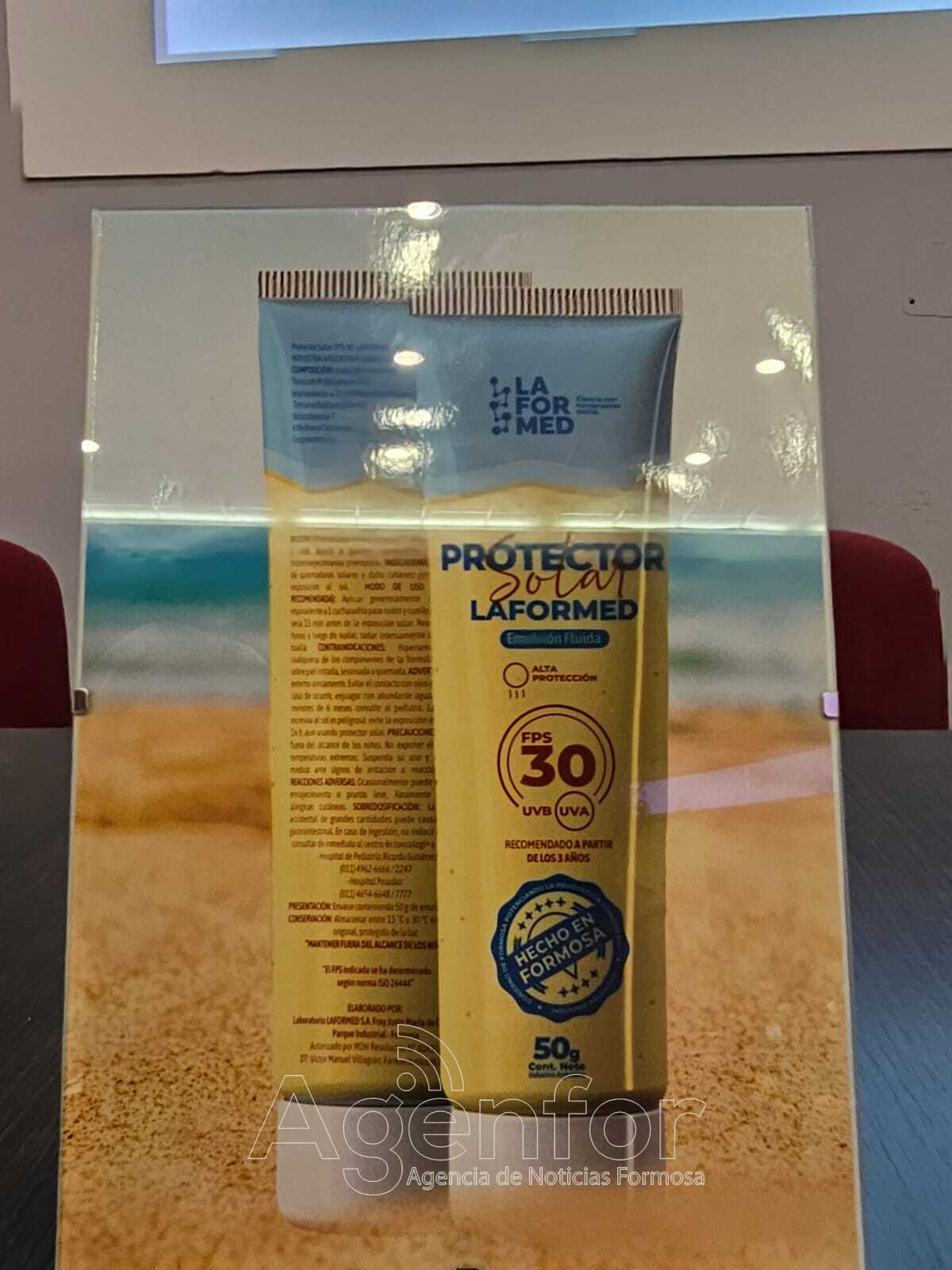 Explicó que “el protector solar es de factor de protección 30” y puso en valor que se trata del “resultado de un trabajo de investigación, a base de muchas pruebas-errores, materializado por profesionales formoseños”.